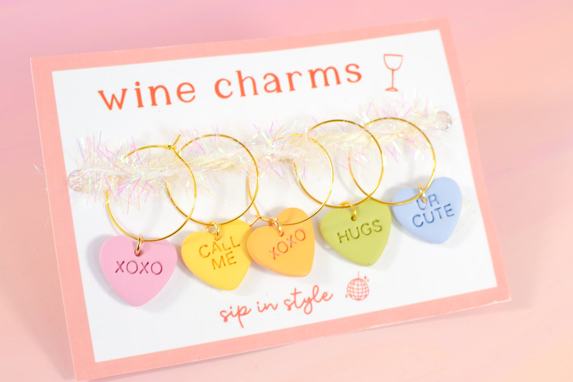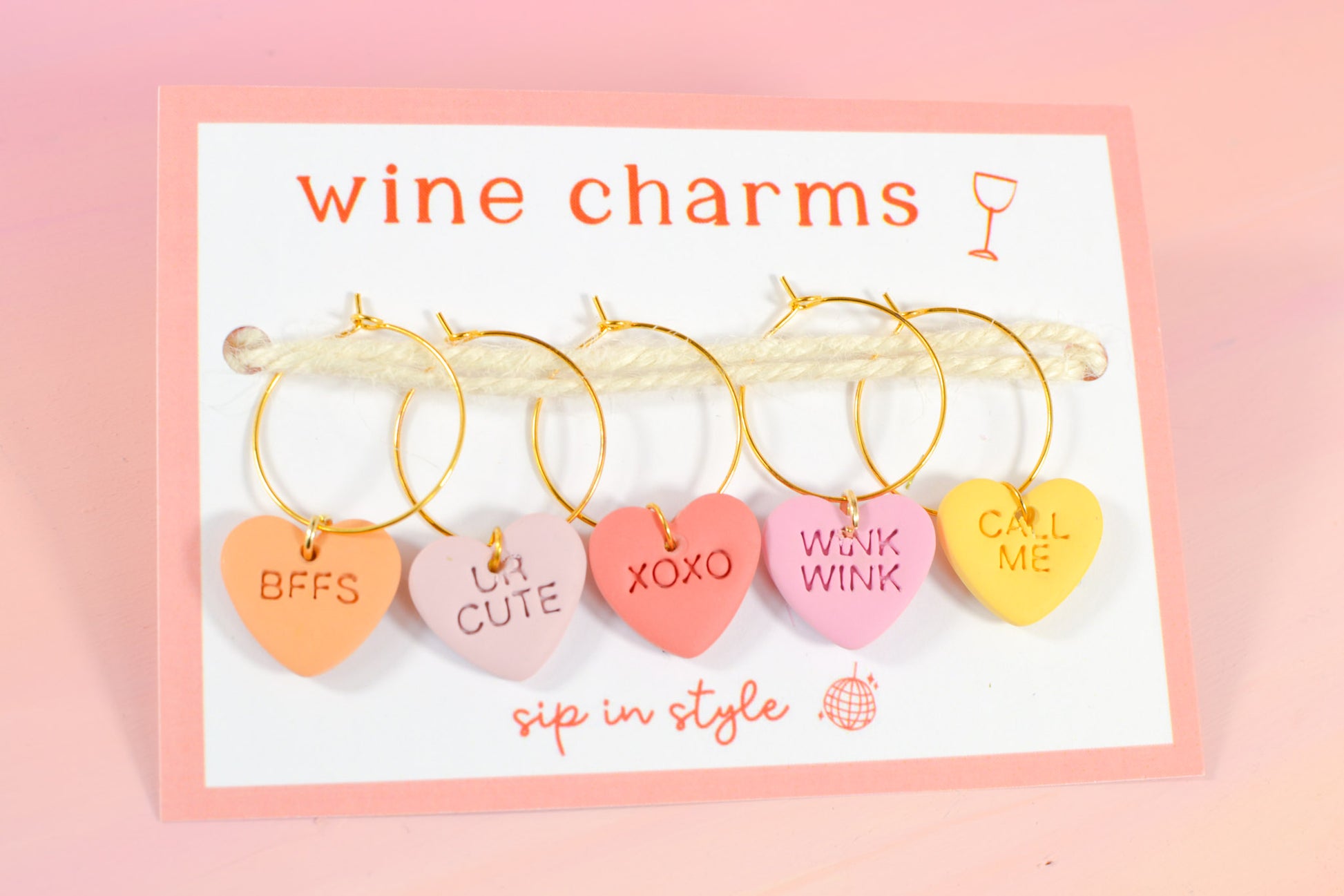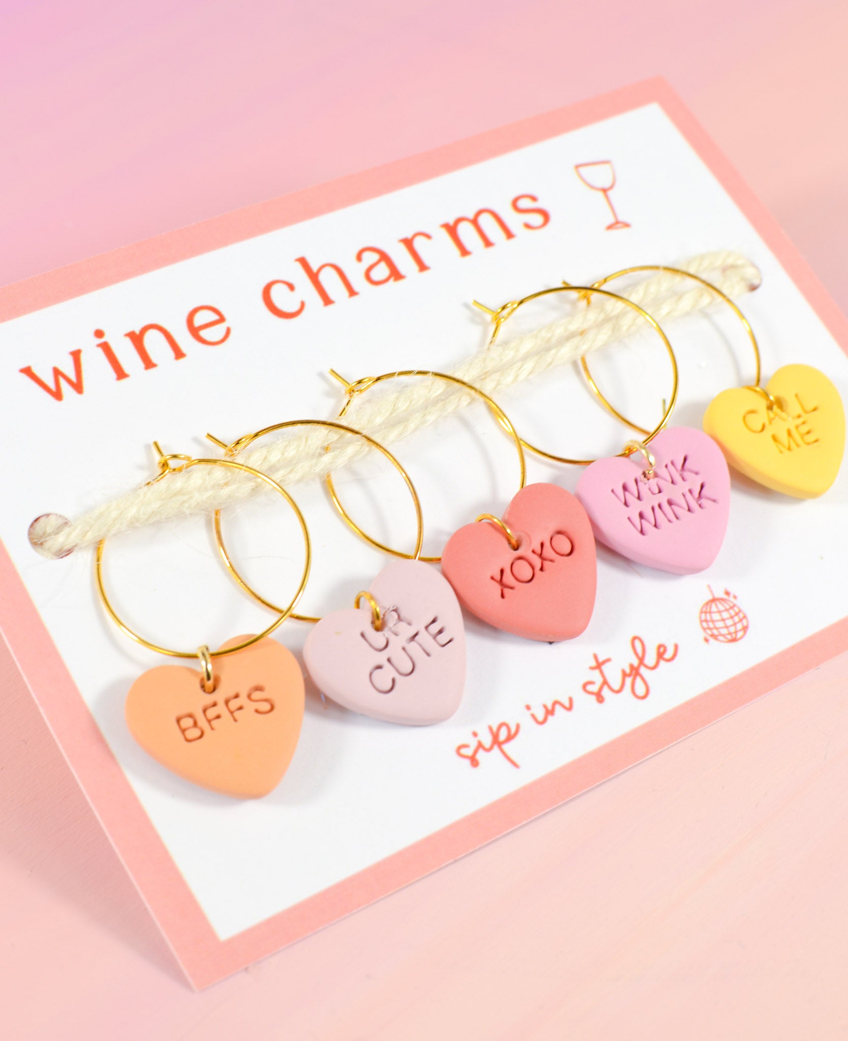 We made a small batch of the cutest lil wine glass charms for Valentine's dayΒ orΒ any day your glass needs a little extra love. They're handmade from lightweight, water-resistant clay and the perfect gift for the wine lovers, mocktail makers, hostesses, and cheesy ones in your life.Β