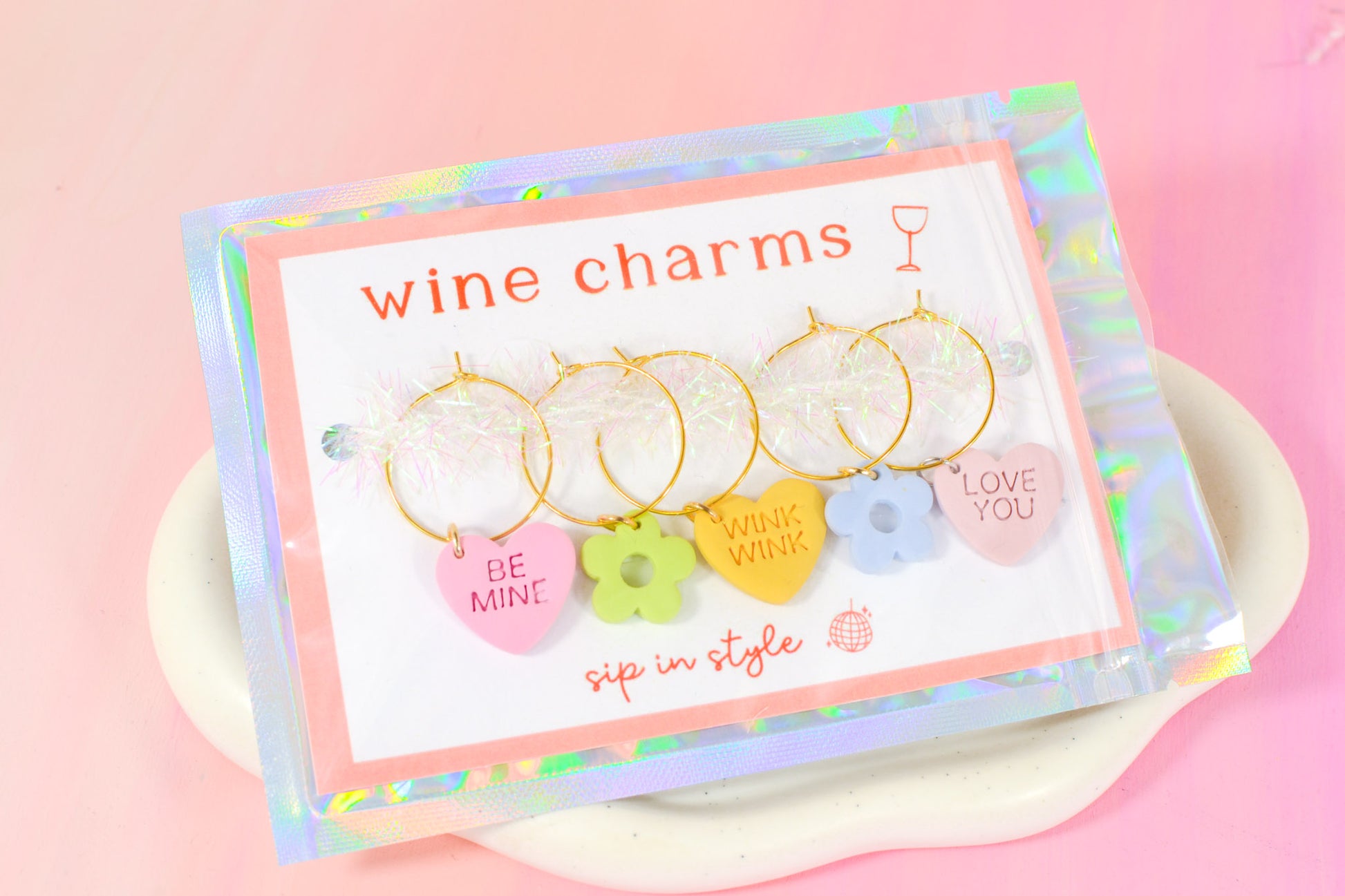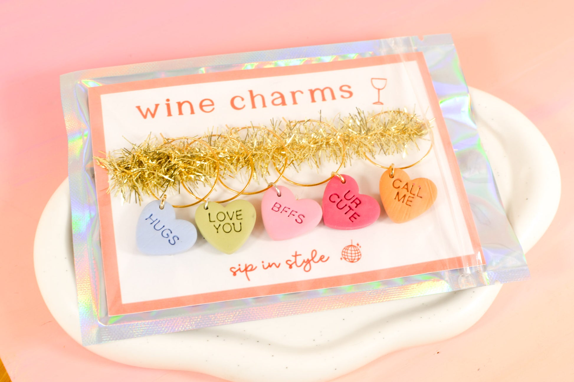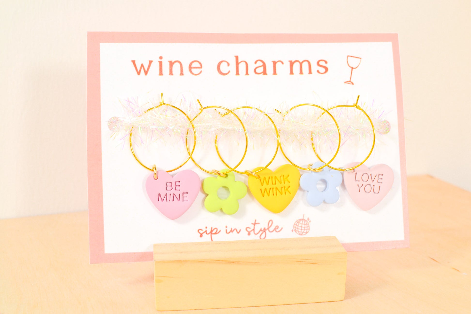 We made a small batch of the cutest lil wine glass charms for Valentine's dayΒ orΒ any day your glass needs a little extra love. They're handmade from lightweight, water-resistant clay and the perfect gift for the wine lovers, mocktail makers, hostesses, and cheesy ones in your life.Β