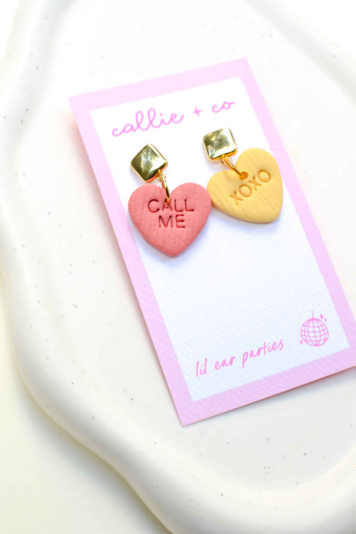 ♥ Lightweight polymer clay earrings handmade in San Francisco. Each order will be a unique combination of conversation hearts and colors.