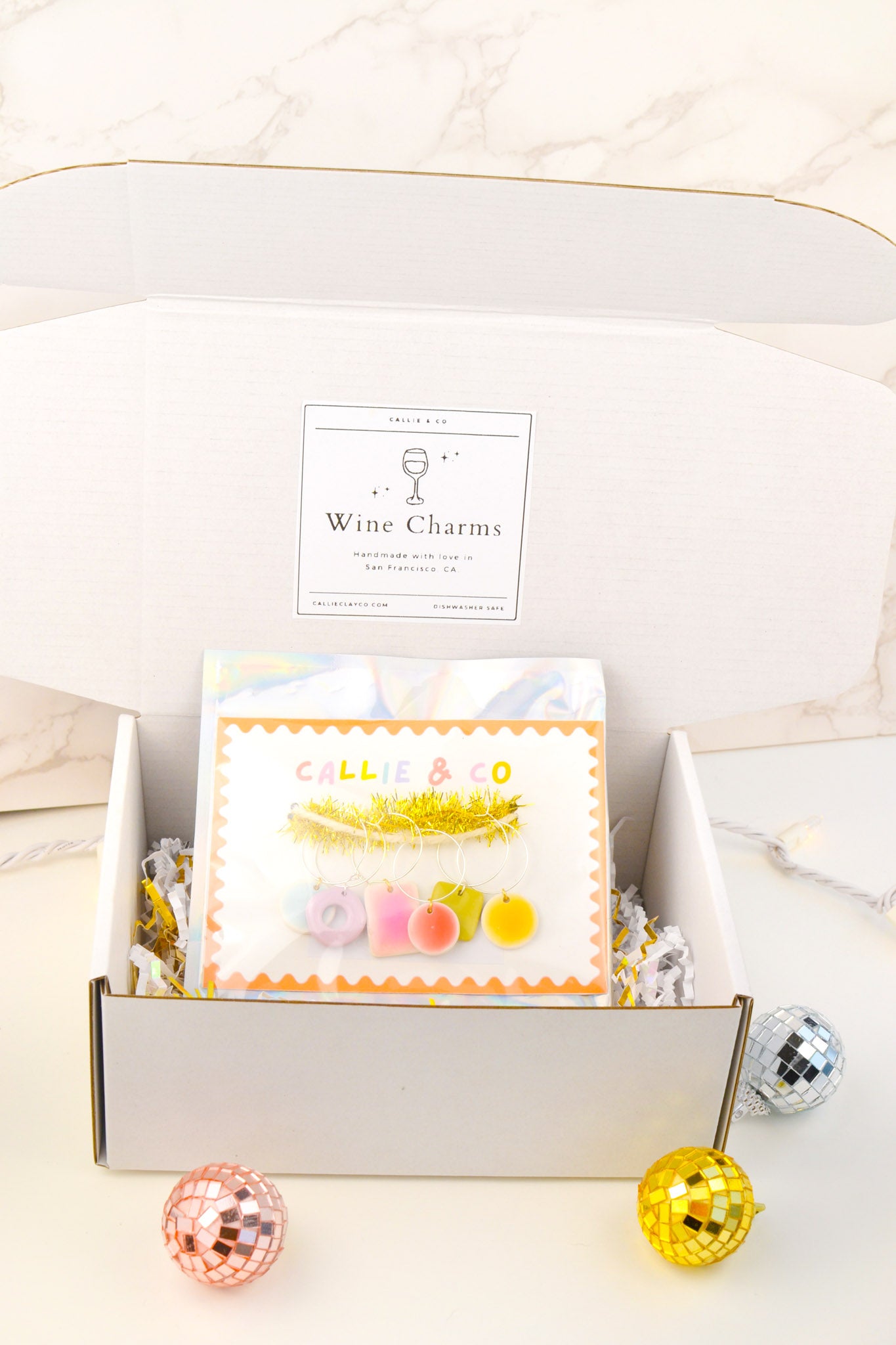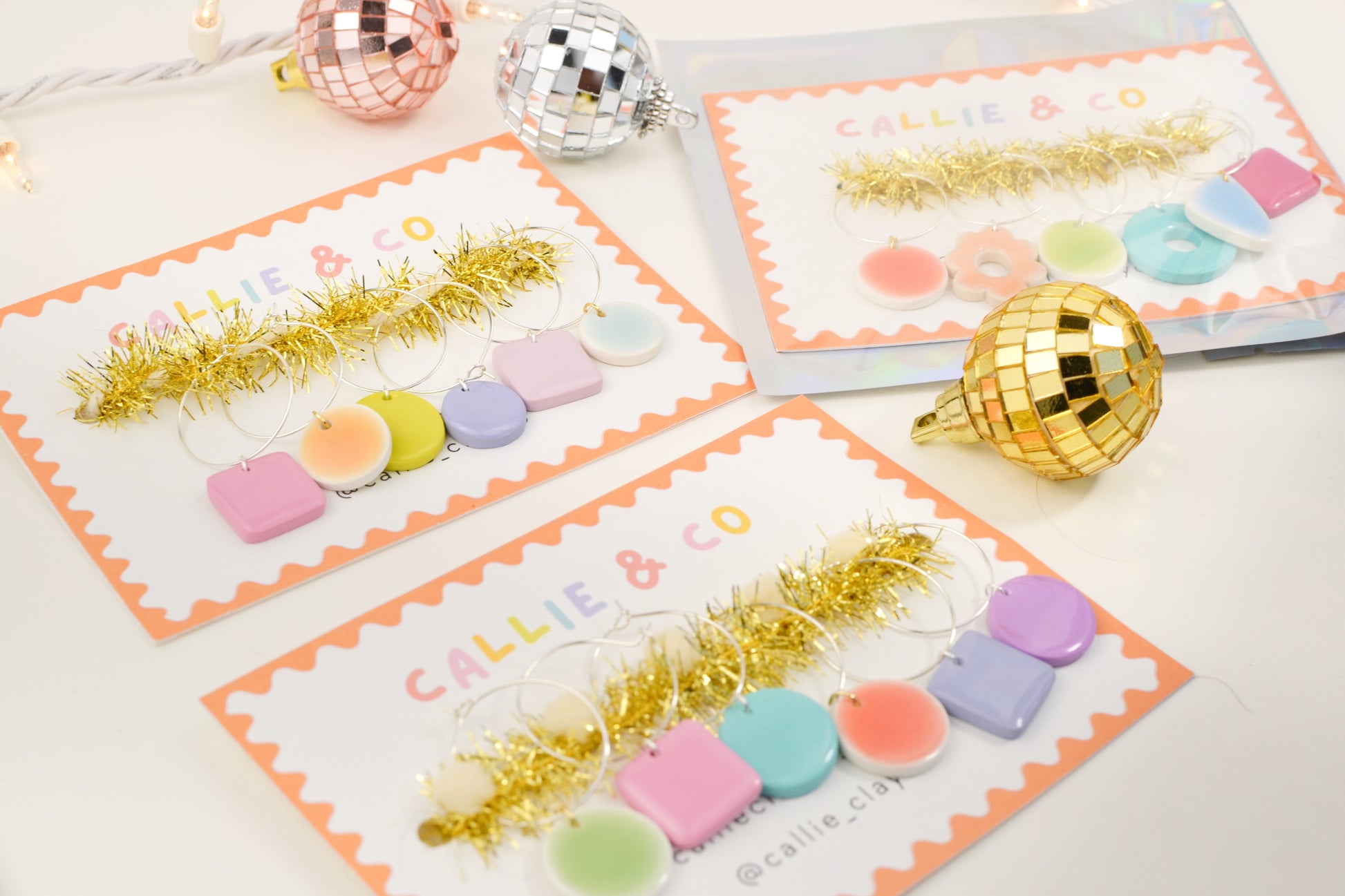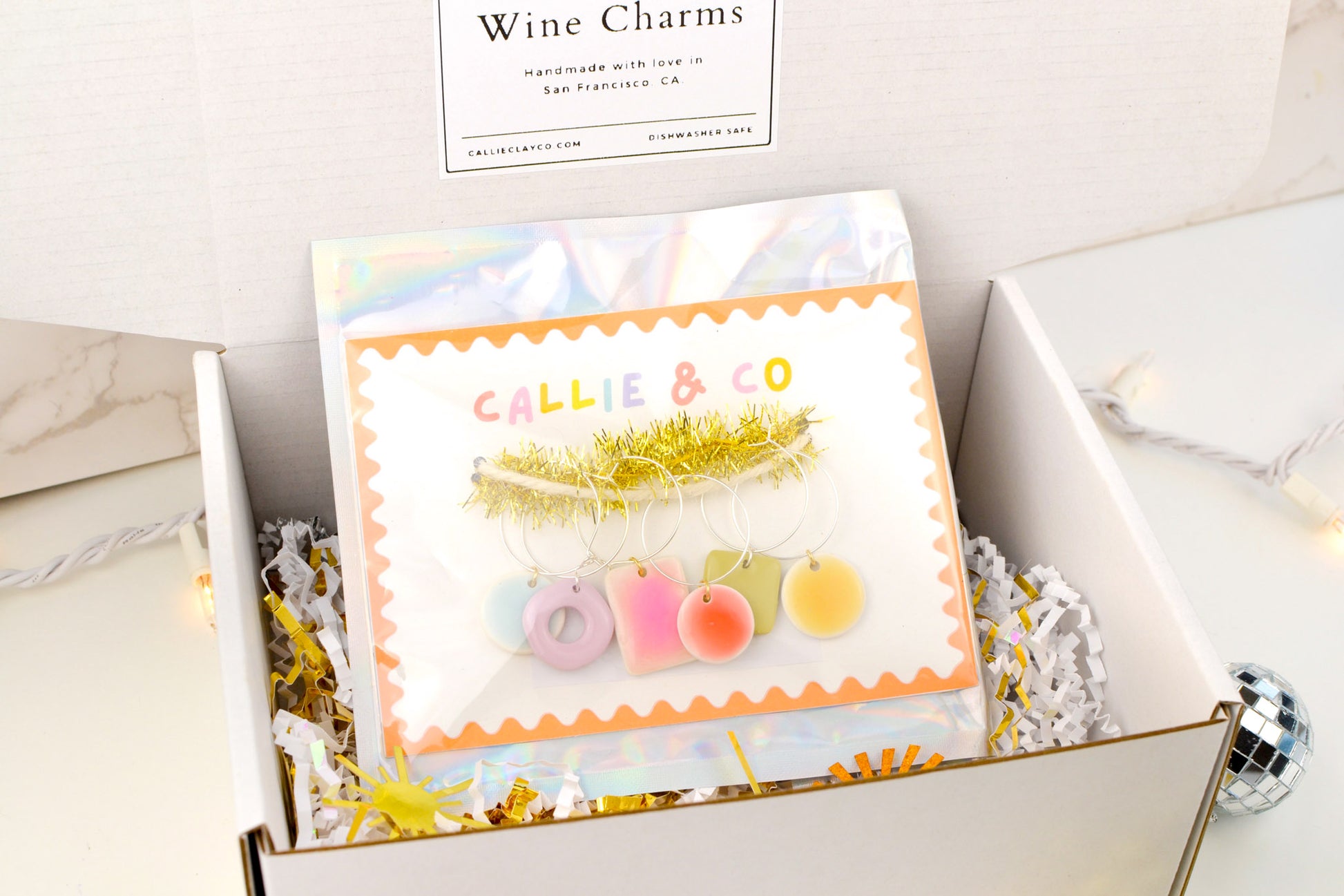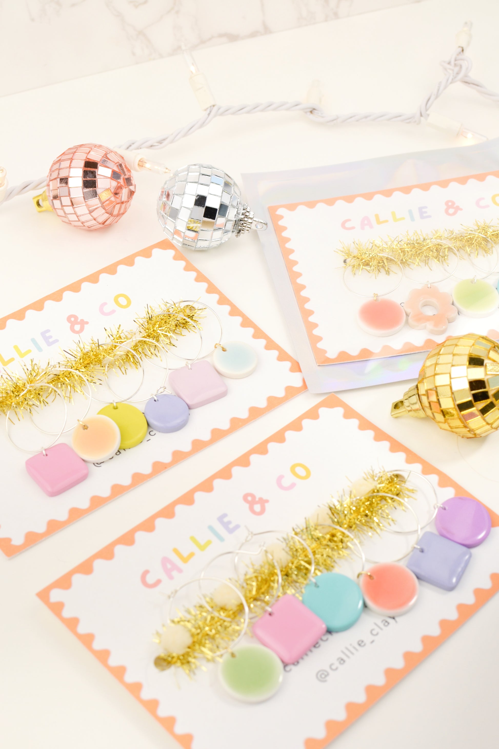 Each set comes with six hand-painted, lightweight, and dishwasher safe clay charms. They are an assortment of colors, shapes, and designs — your mix will be a surprise!