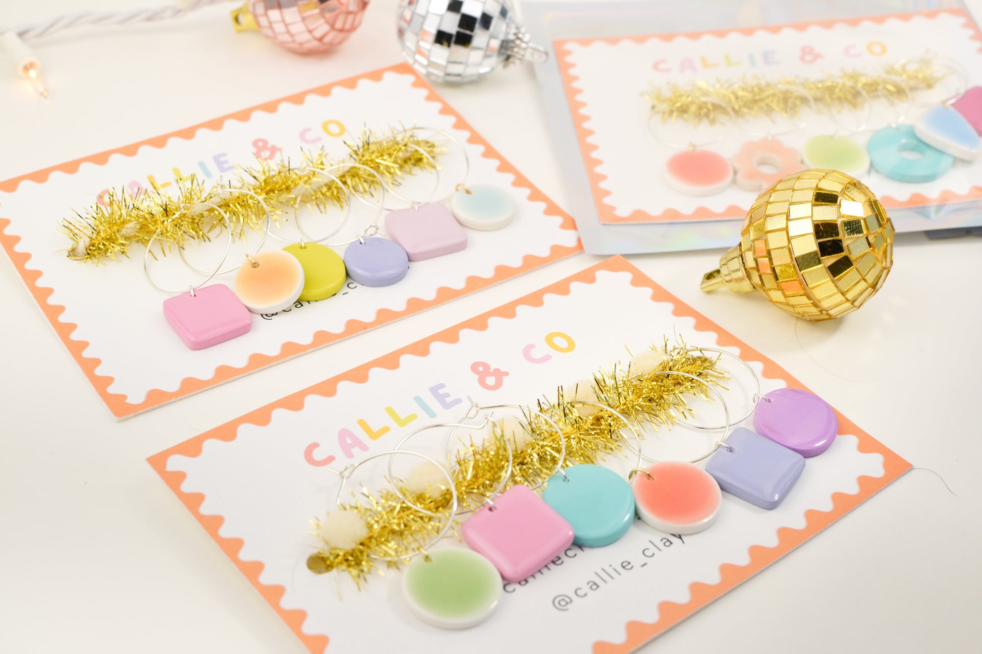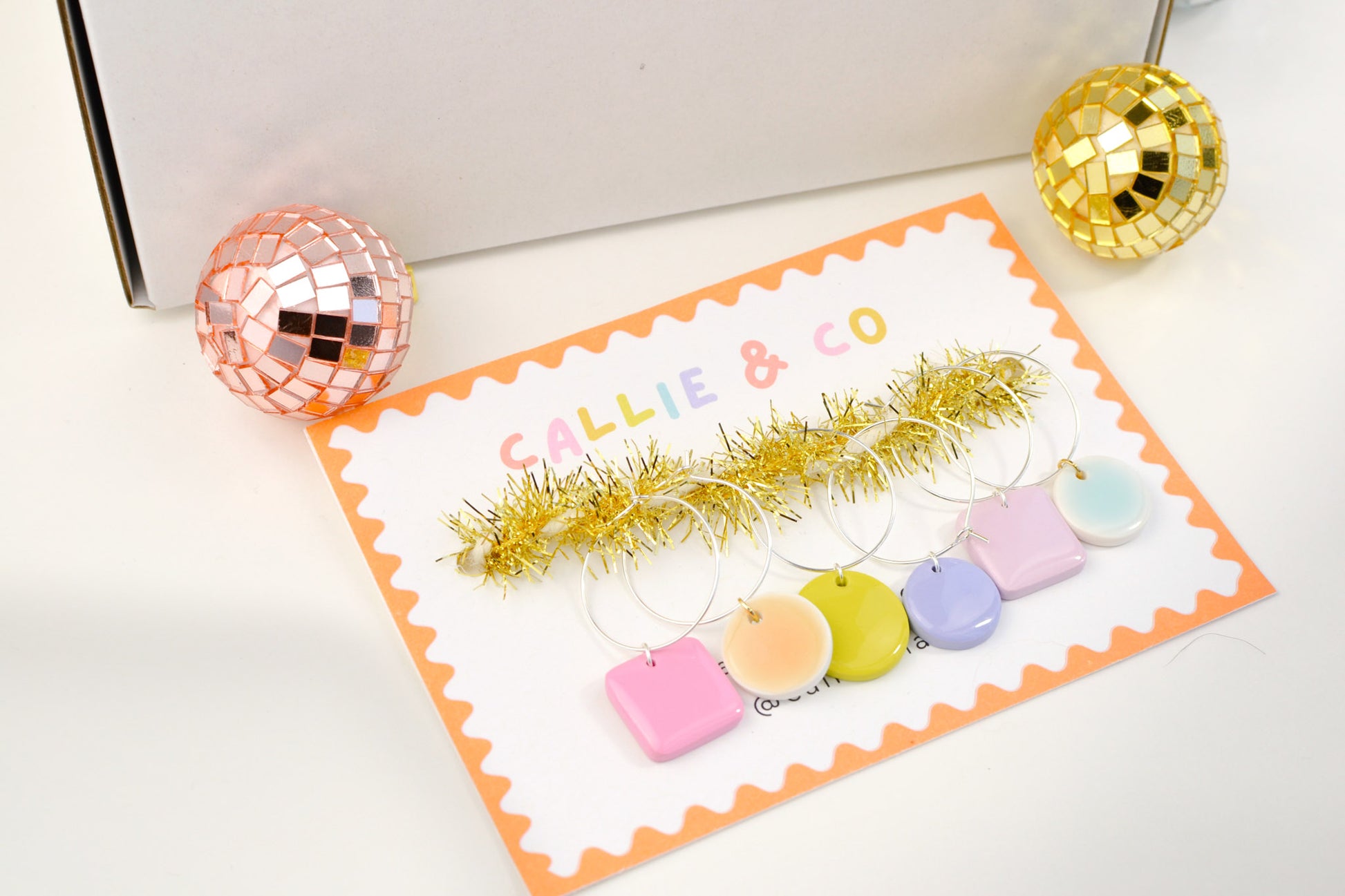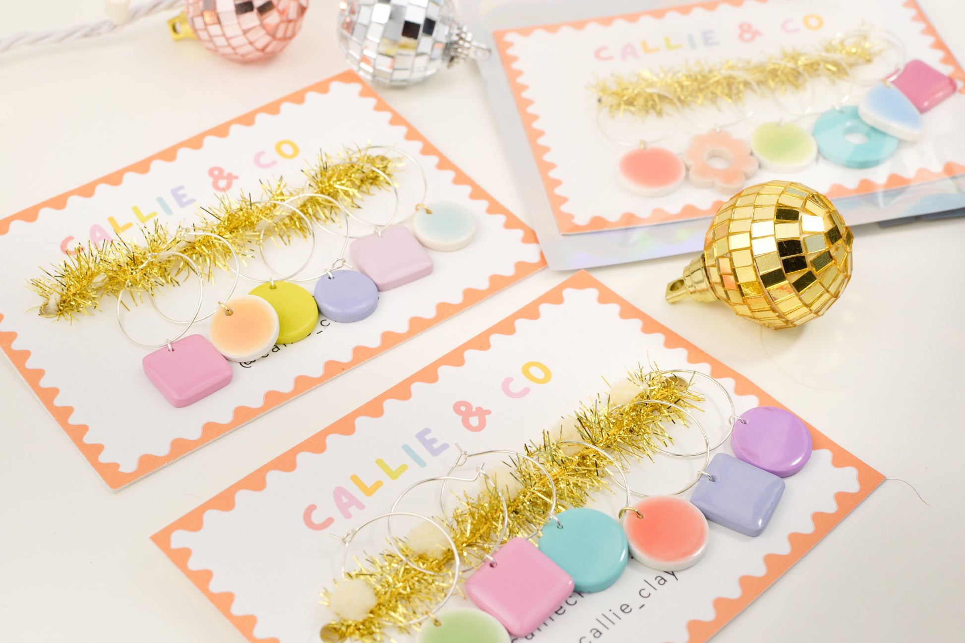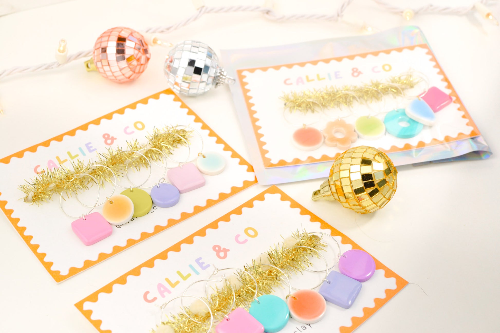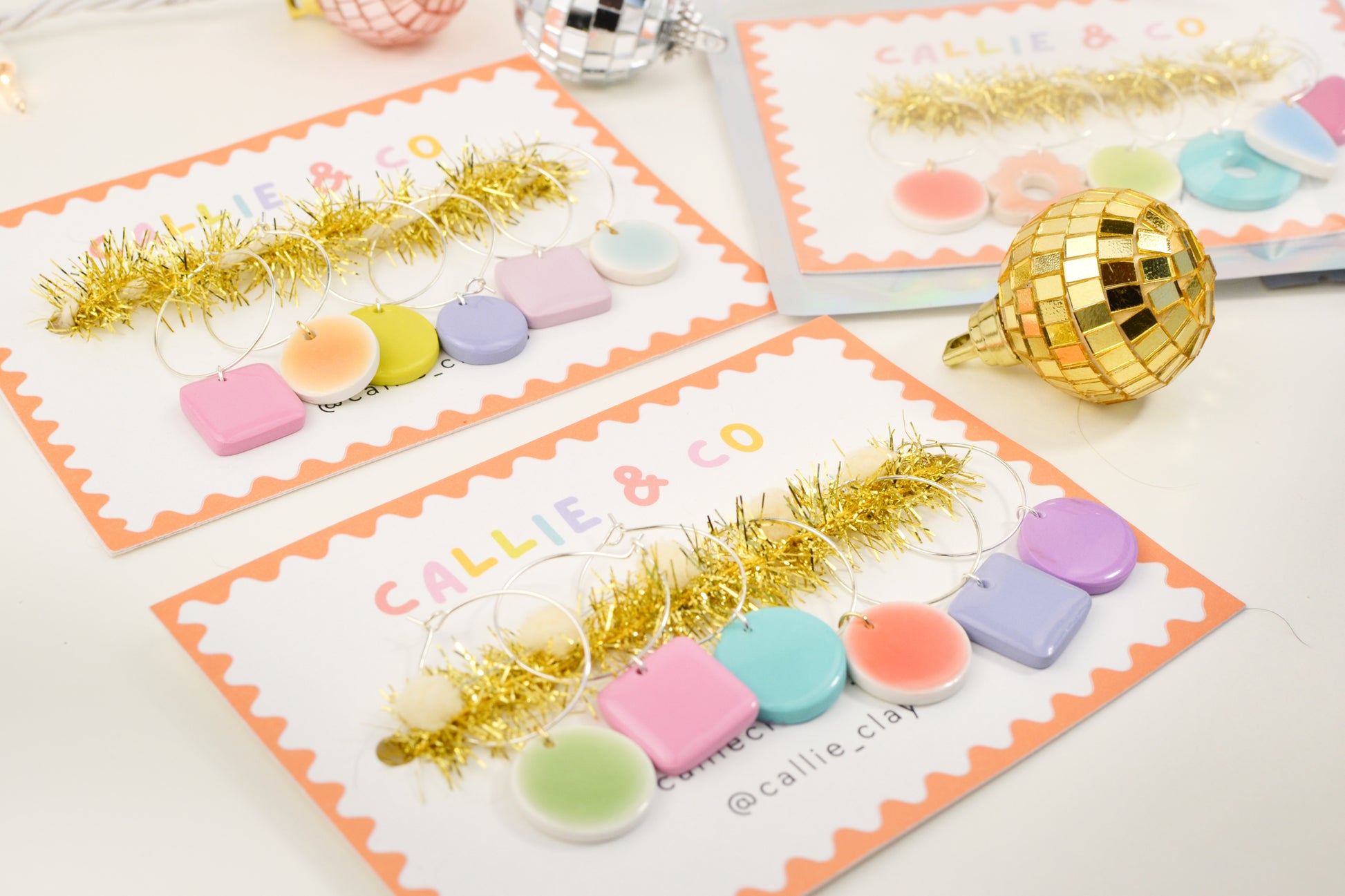 Each set comes with six hand-painted, lightweight, and dishwasher safe clay charms. They are an assortment of colors, shapes, and designs — your mix will be a surprise!